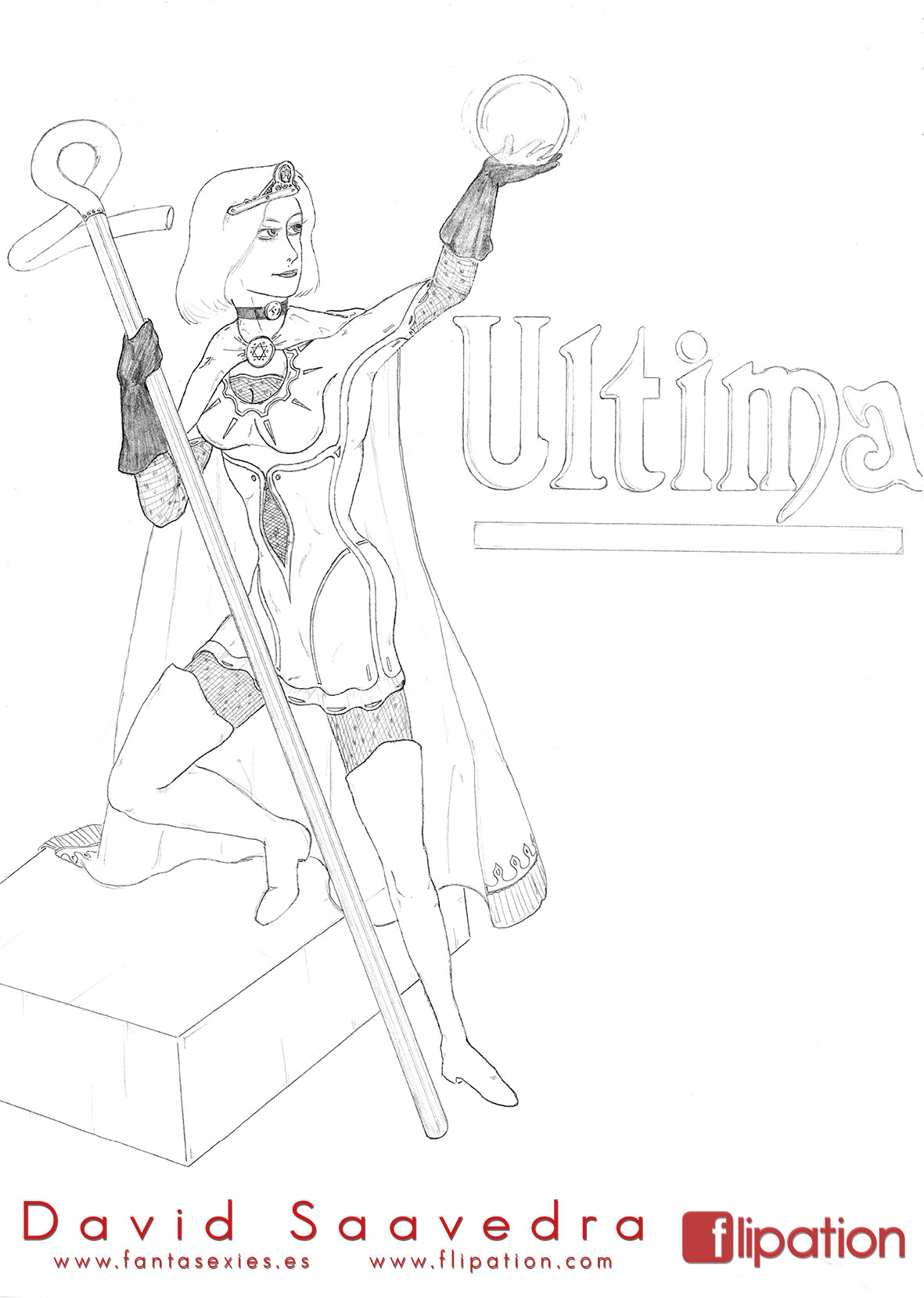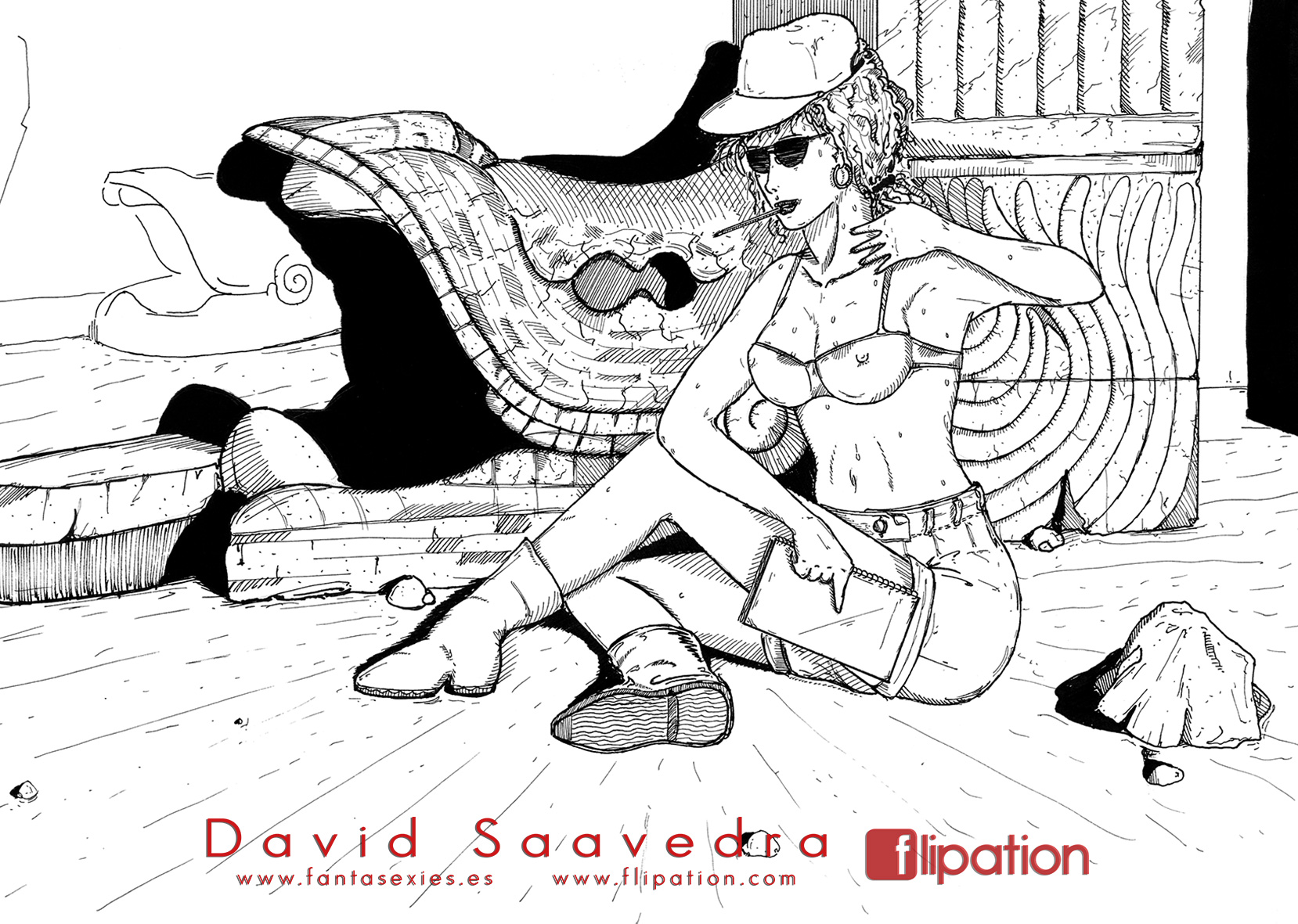 Dibujo de una exploradora en unas ruinas mayas. Una idea previa sin ninguna conexión con lo que luego sería Lara Croft en los juegos de Tomb Raider.