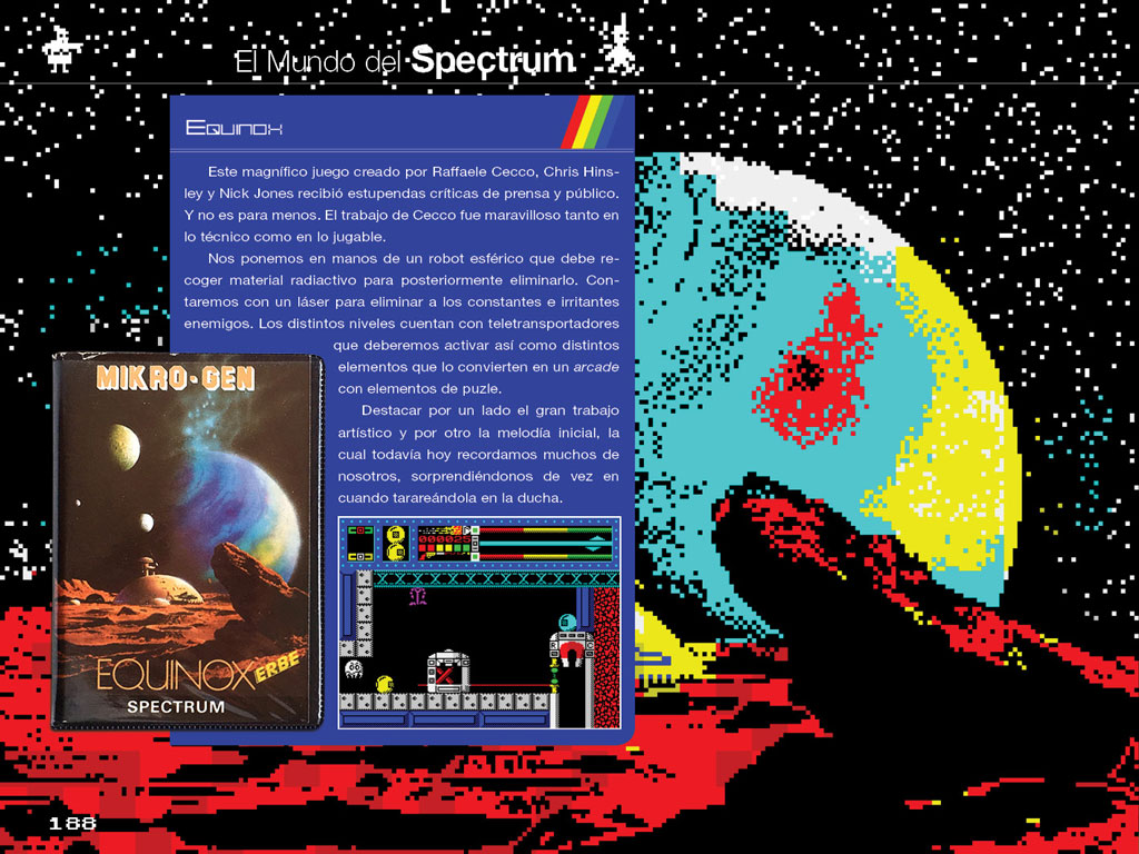 Este libro surge con la idea de plasmar sobre el papel todo el conocimiento que atesoran sobre la máquina de Sinclair el equipo de la web homónima de El Mundo del Spectrum: Javier Ortiz, Alejandro Ibáñez, Jesús Martínez del Vas y Juan F. Torres, que contaron con la inestimable ayuda de Manu Rico, el cual le dio forma al proyecto y sirvió de catalizador para hacerlo posible. Una vez el texto llegó a mis manos, empecé a darle forma para convertir la historia del ordenador que marcó mi infancia en un libro que todo el mundo pudiese disfrutar de una manera lo más visual posible. 224 páginas que ha sido todo un placer diseñar y maquetar, desde la primera a la última. Un trabajo largo y concienzudo, cargado de detalles y que no solo se nutre de capturas de pantallas e imágenes escogidas de internet sino que cuenta también con fotografías de los juegos originales de las colecciones personales de JMV y Juanfran.
