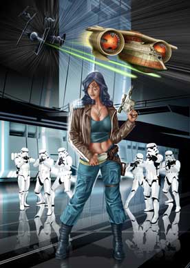 No es la primera vez que hago una ilustración de este universo. La primera es del año 2003, una ilustración dentro de la cantina de MosEsley, hecha a la manera tradicional, con aerógrafo y pincel que me llevó mucho tiempo terminarla. Otra fue una pin-up en toda regla para la